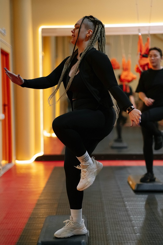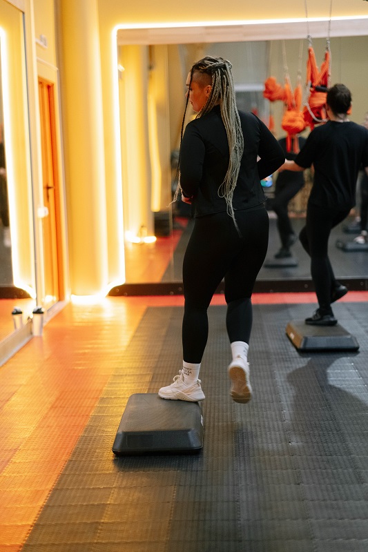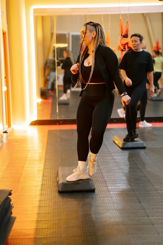 Ритмичные подъемы и спуск по платформе (степу) создают кардио-нагрузку, подобную ходьбе по лестнице, но с элементами танца.